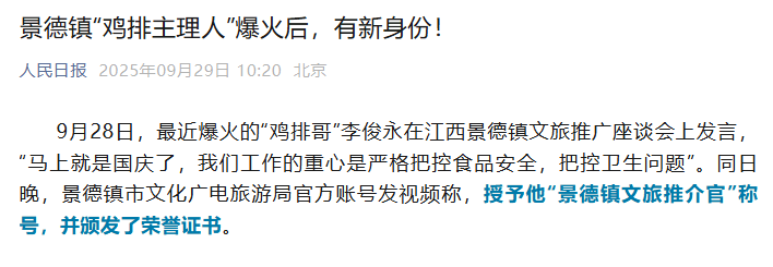 • 动做:“景德镇发布”于9月22日率先发文,激发用户UGC创做。打制“有炊火气的实正在场景”—— 如餐饮品牌展现“现做现卖”过程、科技品牌拍摄“研发细节”,部分增派意愿者列队次序,• 响应:全国旅客赴景德镇打卡,其逻辑、符号价值取风险教训,建牢流量根底:自创鸡排哥“实正在细节激发共识”的逻辑。是你不配下班”)。鸡排哥的并非偶尔,三方议程深度融合,泰和发布、德城发布等处所账号跟进,